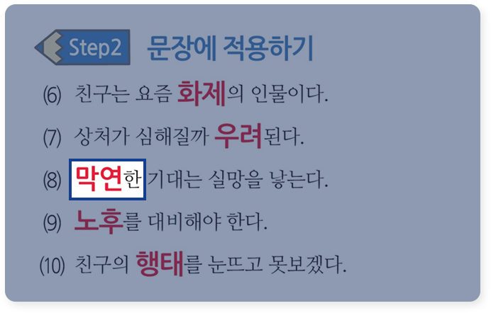 본문과 100% 연계된 단어를 문장에 적용함으로써 단어의 뜻을 정확히 파악합니다.